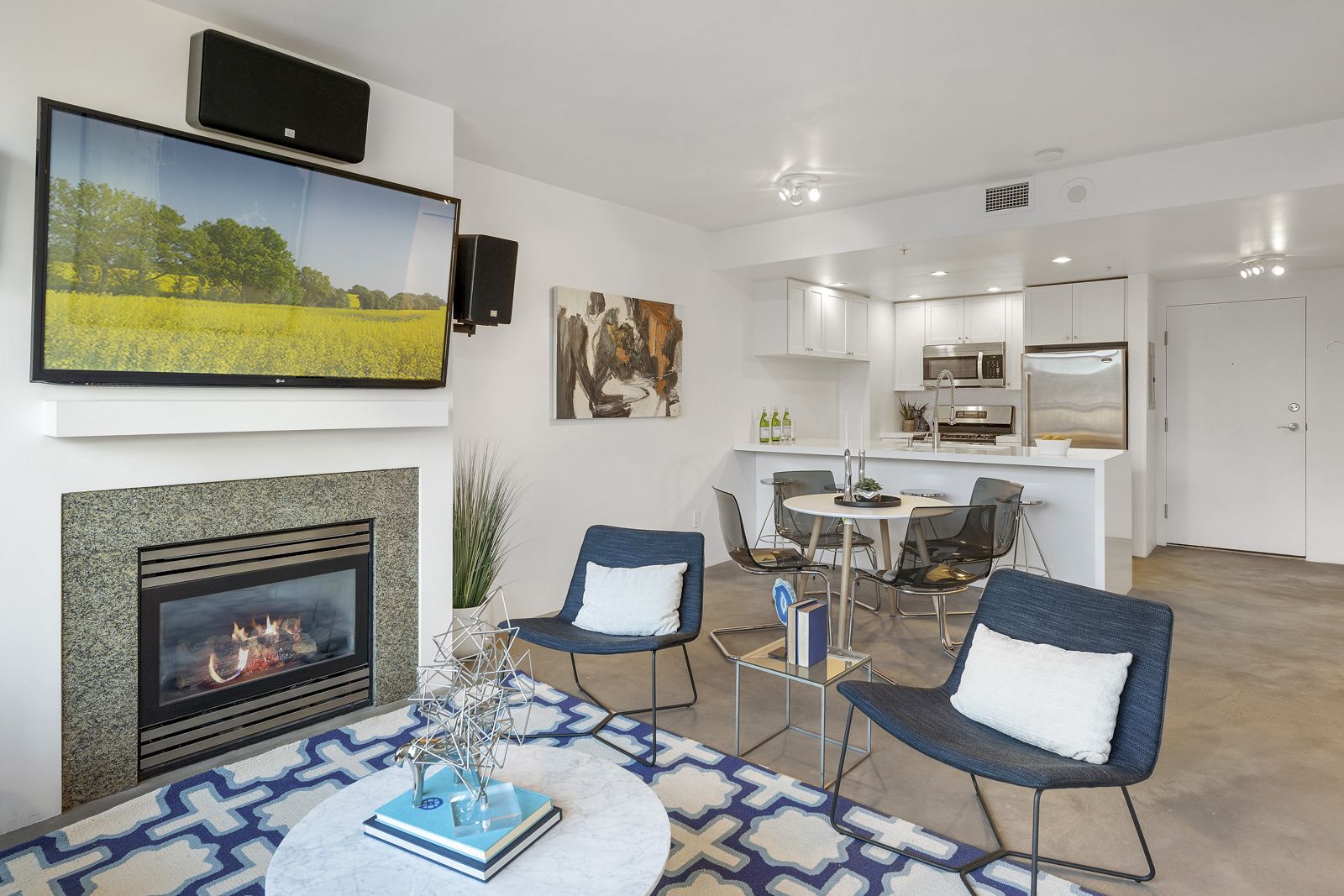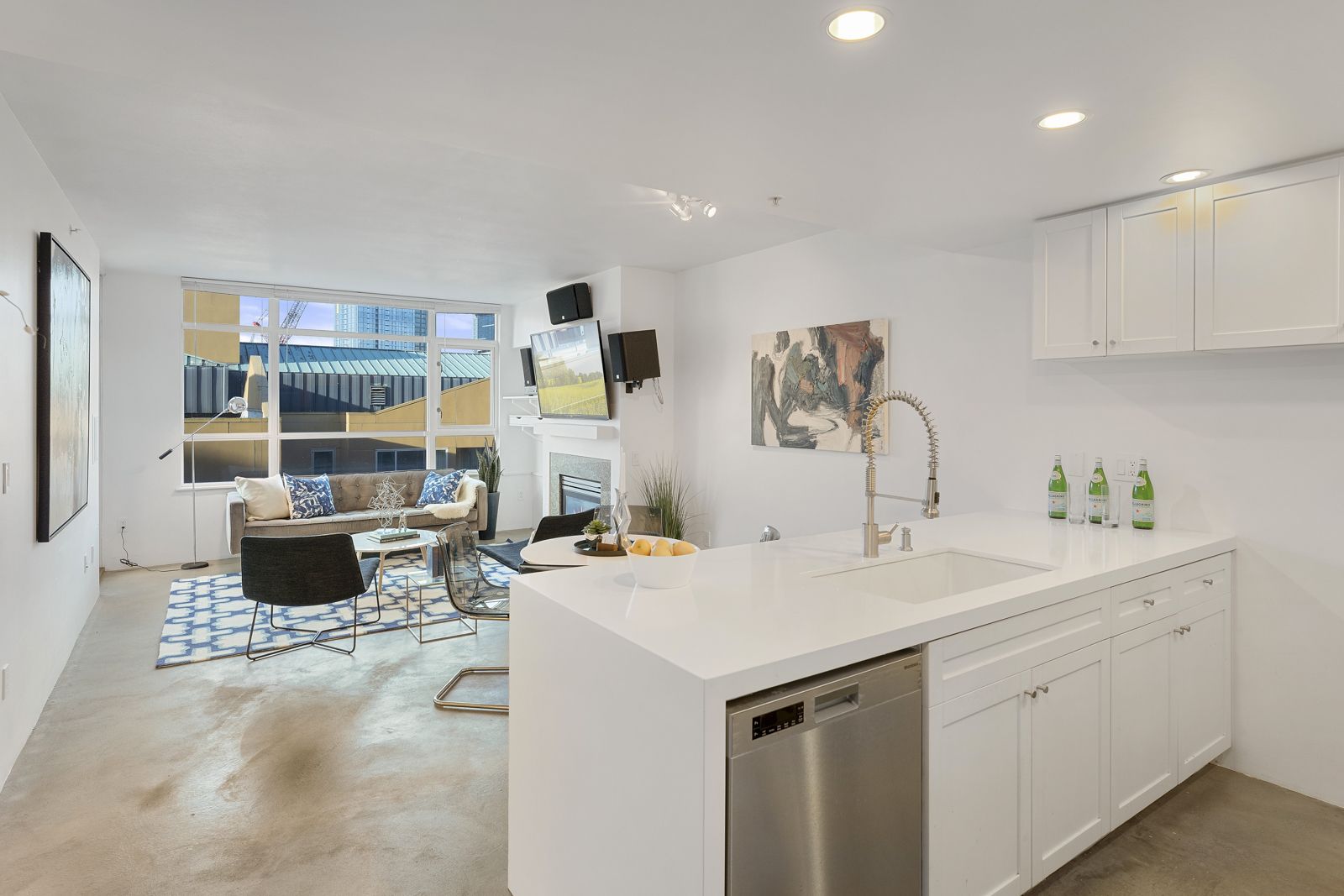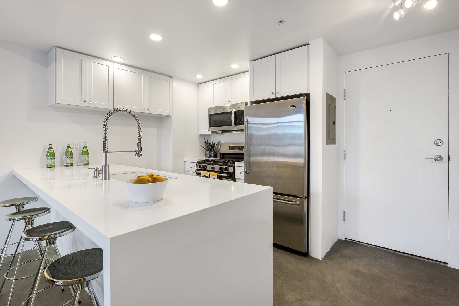 Chic all-white finishes, air conditioning, a gas range, stainless steel appliances, quartz countertops, concrete floors, home theater system with a 60” TV.