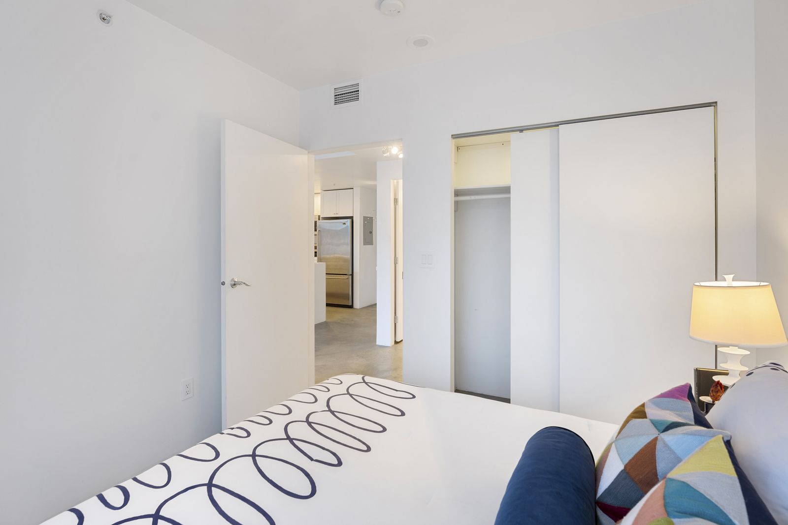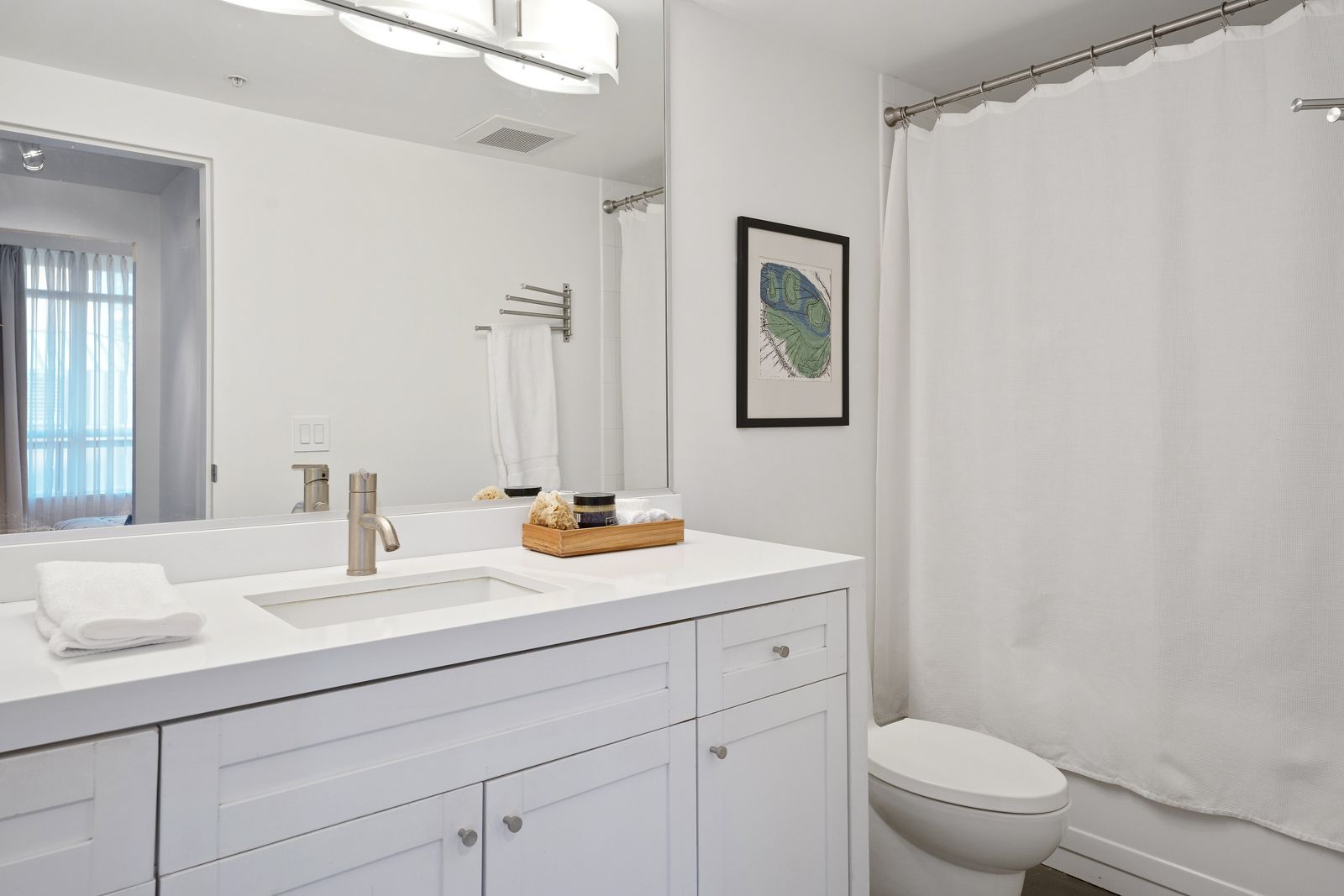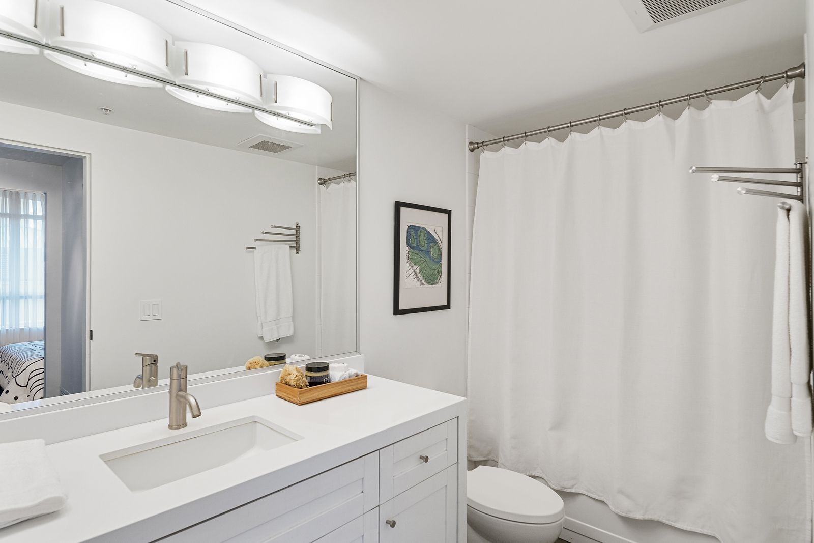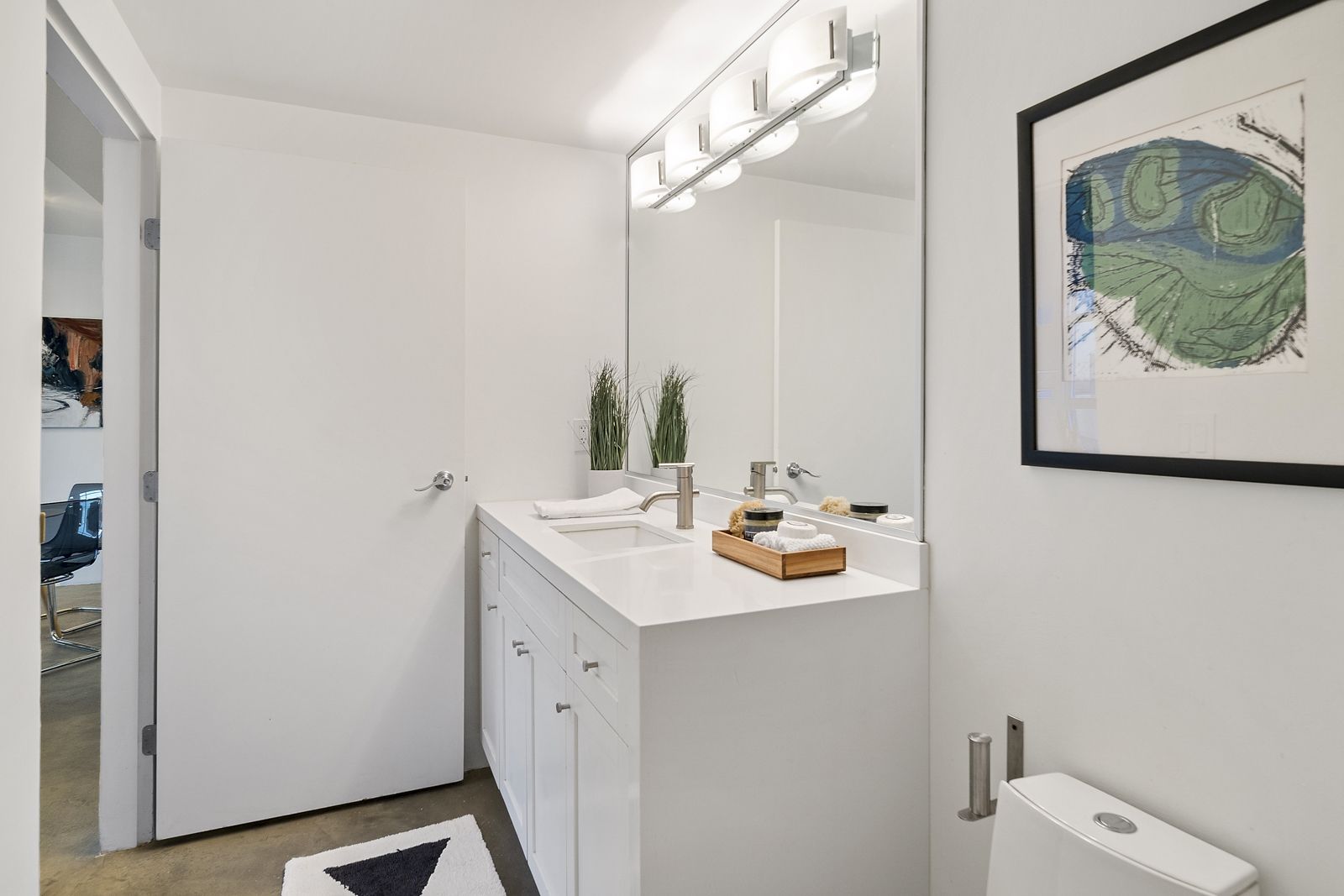 Chic all-white finishes, air conditioning, a gas range, stainless steel appliances, quartz countertops, concrete floors, home theater system with a 60” TV.