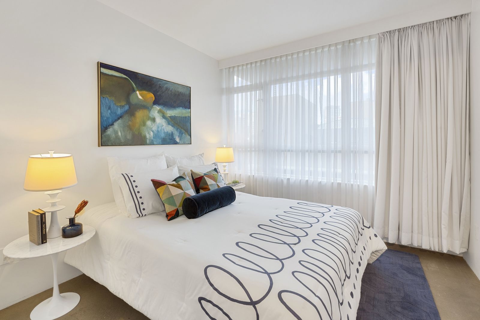 Spacious master bedroom with blackout curtains. And nearly floor-to-ceiling windows fill the spaces with natural light.
