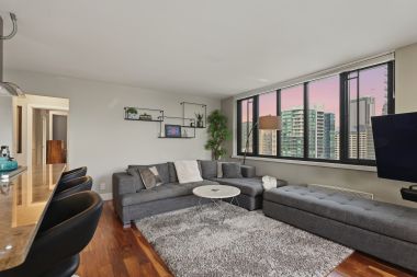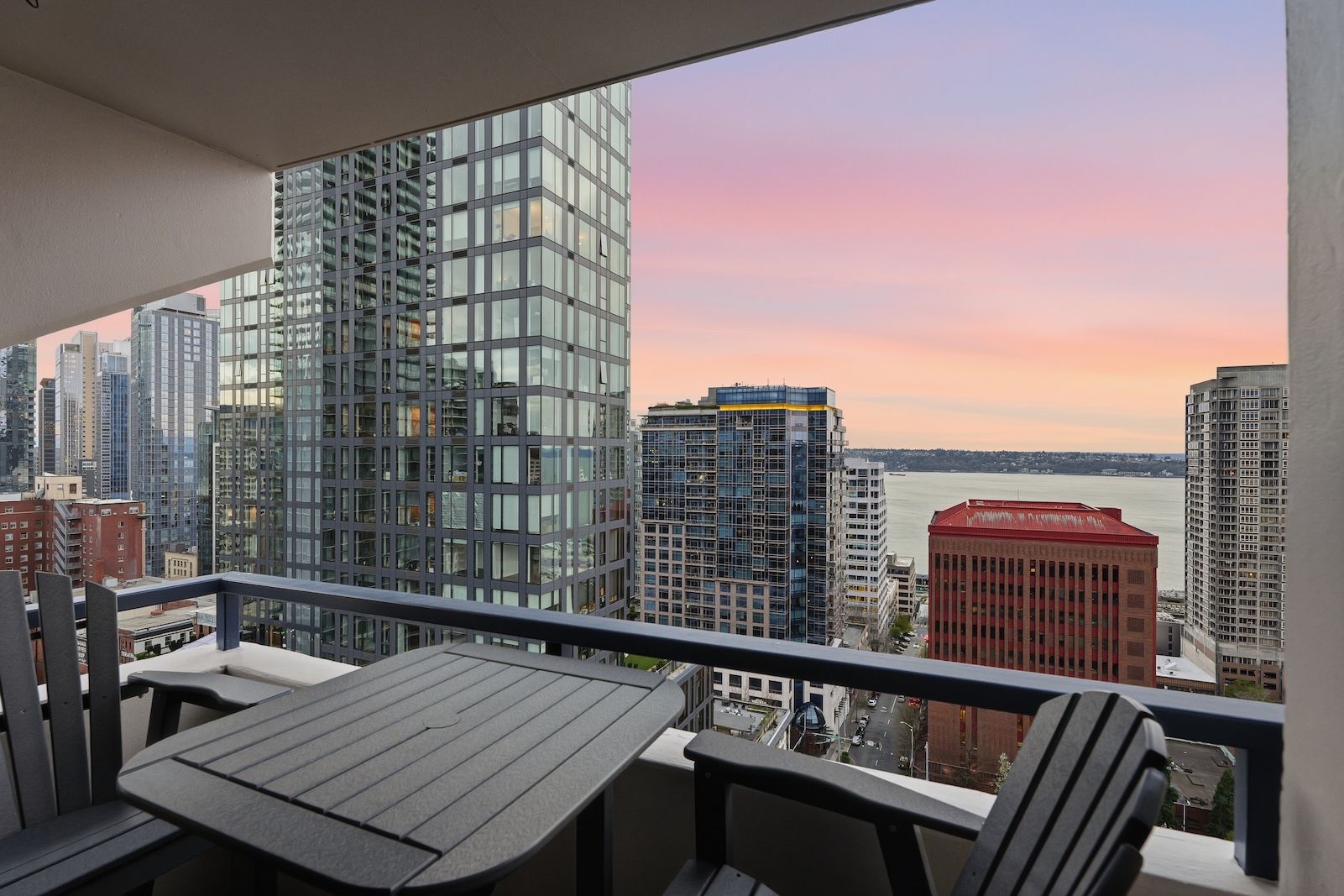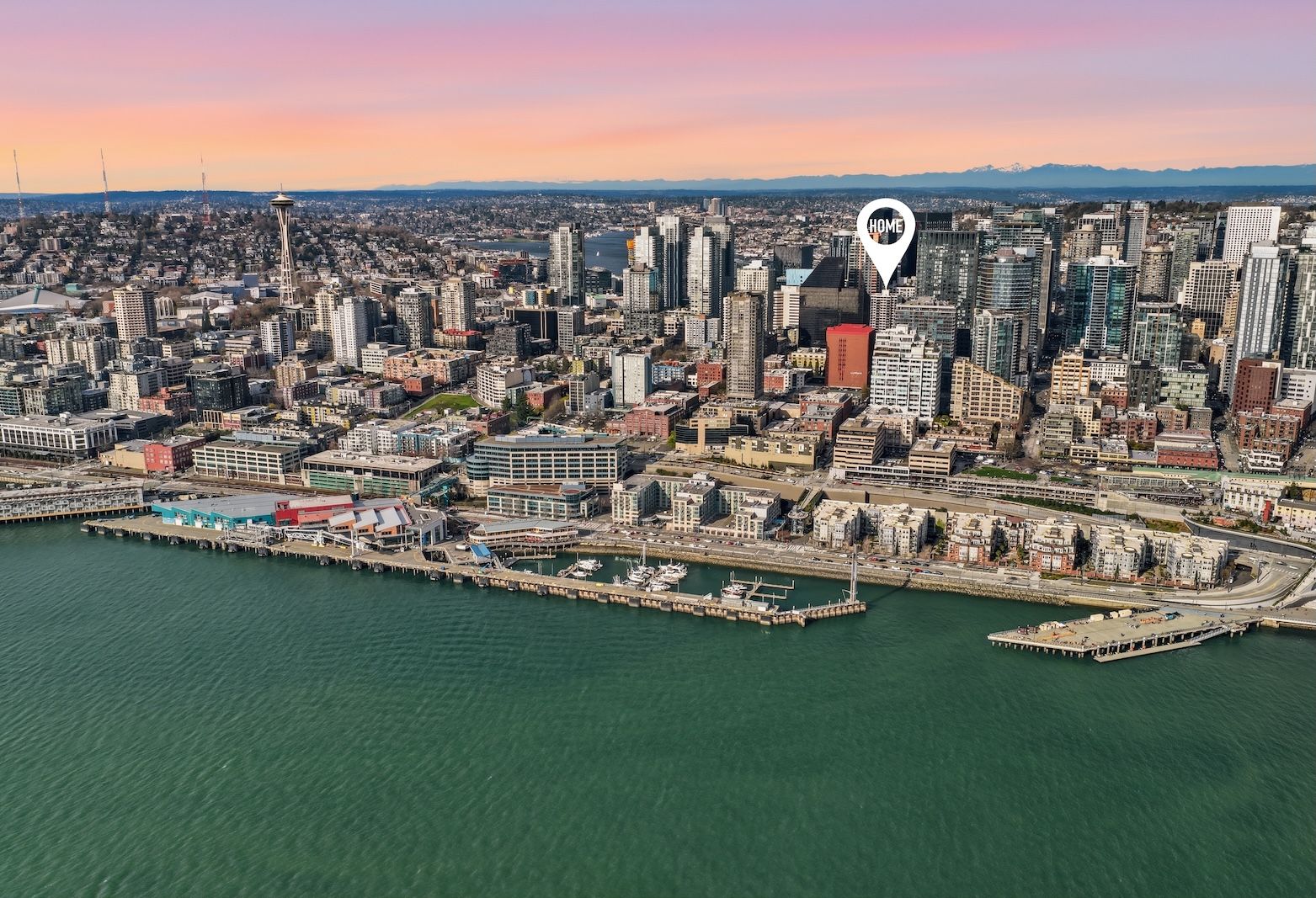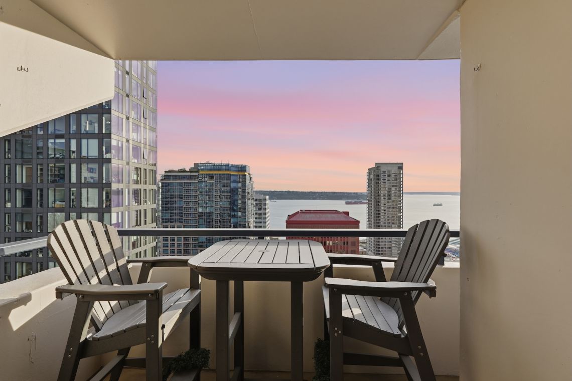 This luxurious penthouse at Royal Crest is where year-round vistas take center stage: come home each day to panoramic views of the Olympic Mountains, Elliott Bay, glorious sunsets, and twinkling city lights. The iconic downtown lifestyle is yours from this unbeatable location with immediate proximity to all the best dining, shopping, nightlife, sports, and cultural events the city has to offer. Be at the heart of it all! Perched 26 floors above the city, this corner unit's layout has been opened up to maximize the views from nearly every room. Warm western light accentuates luxe finishes like engineered hardwood floors, Hunter Douglas top-down/bottom-up blinds, and a remodeled kitchen outfitted with quartzite counters, stainless steel appliances, stylish cabinetry, and a large center island perfect for gathering around. Both bedrooms look out to fantastic views and the sparkling skyline; the primary is bright and spacious with a full ensuite bath, and the second bedroom includes a Murphy bed and custom closet organizers. Free laundry only for 26th-floor residents is right next door, plus your dedicated parking space and storage unit are both in the secure garage. All utilities are included in the HOA dues - even electric and internet! This well-run HOA offers exclusive amenities for residents: an outdoor pool, sauna, fitness center, owner's lounge with a full kitchen, and a terrace with BBQs & fire pits. Welcome home to the ideal intersection of elegance and vibrant urban living.