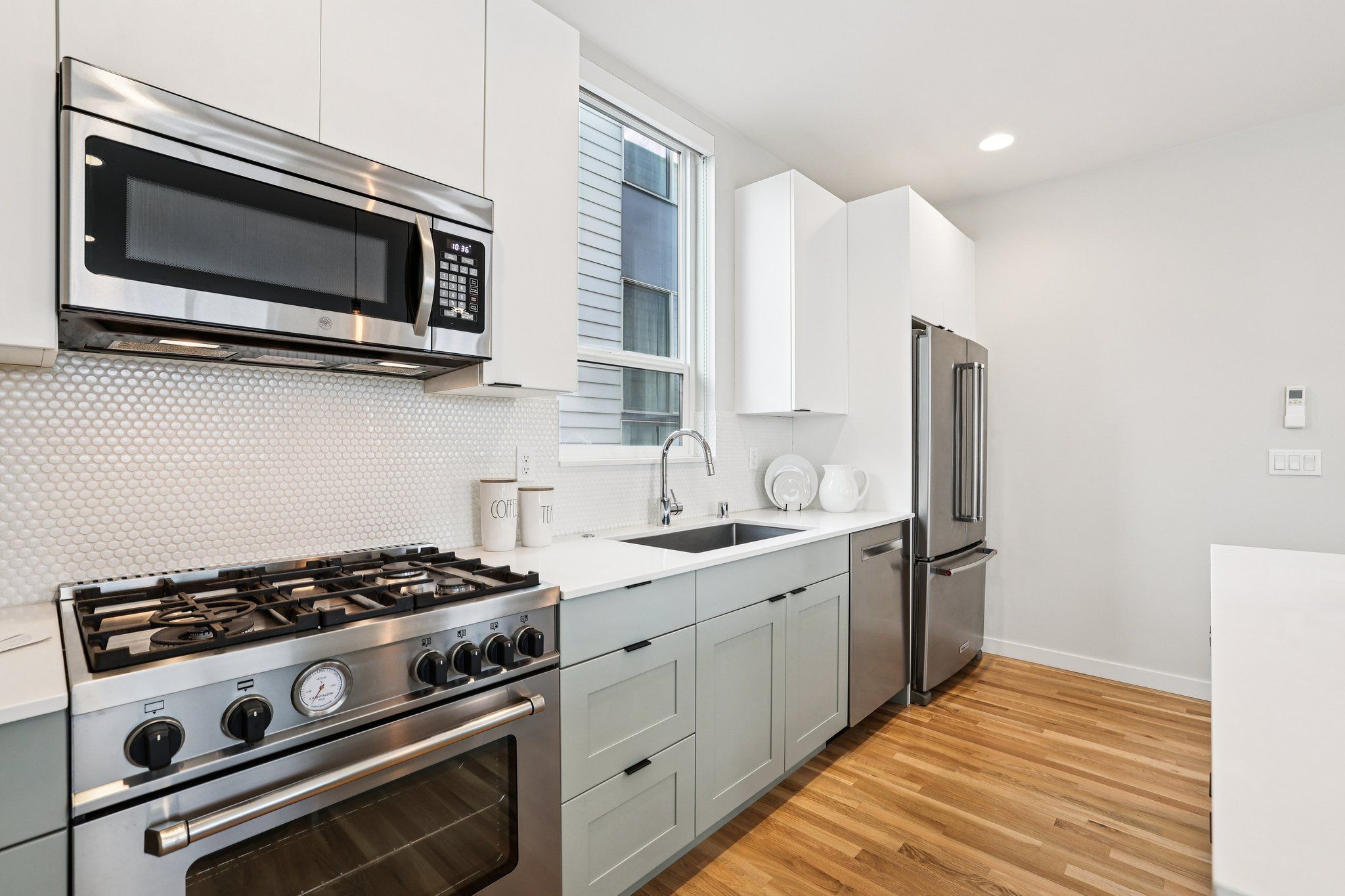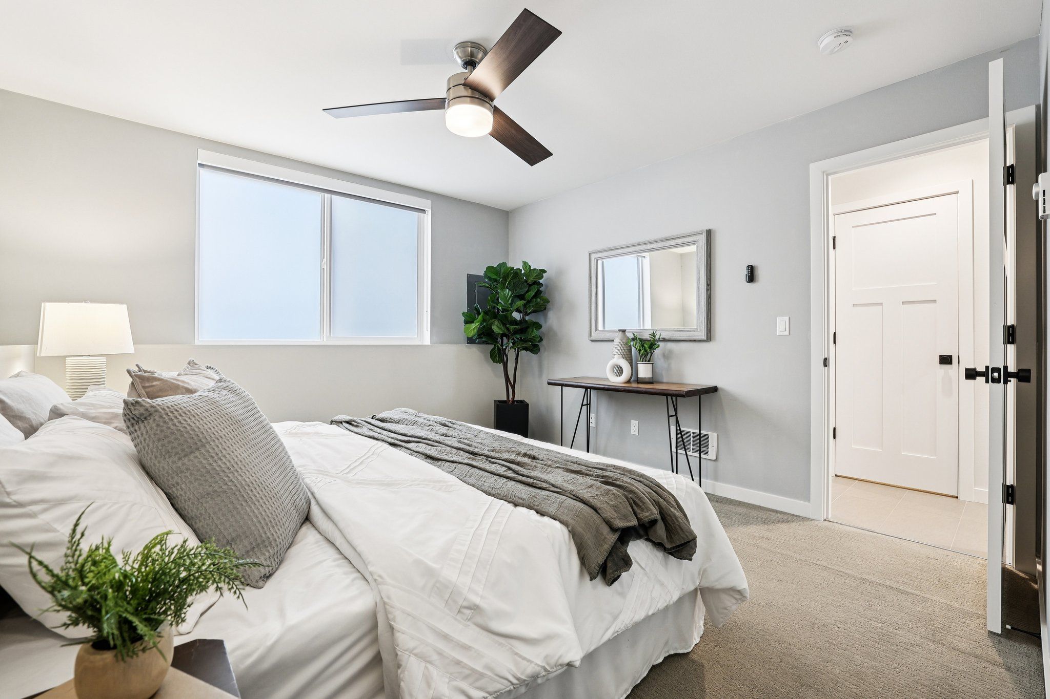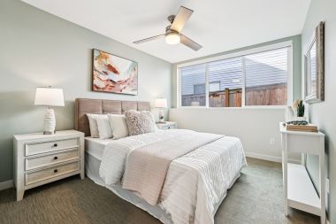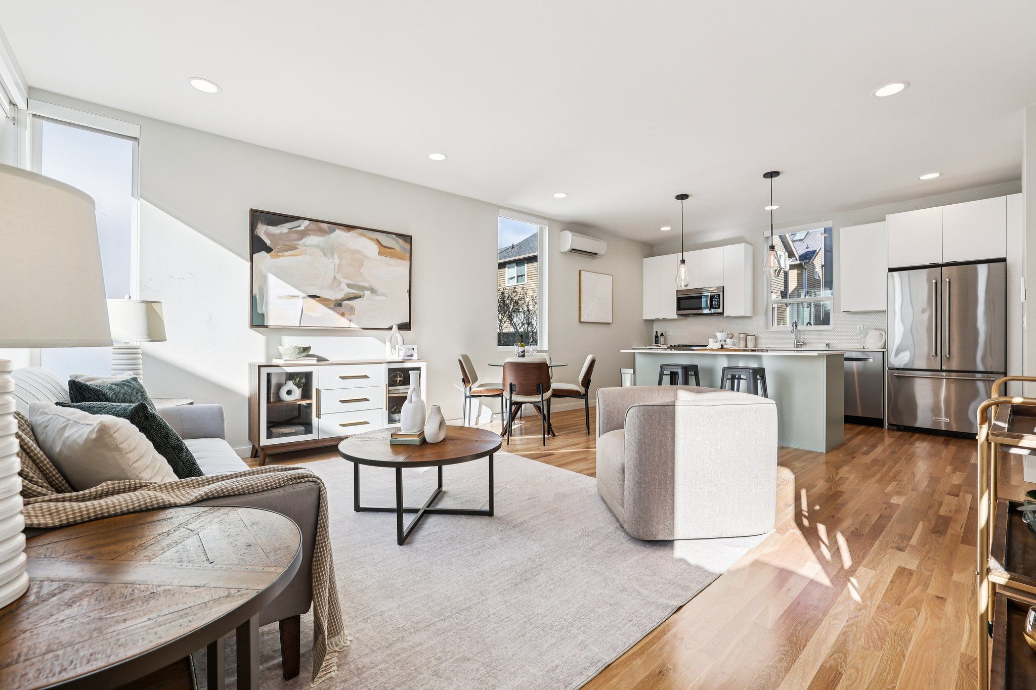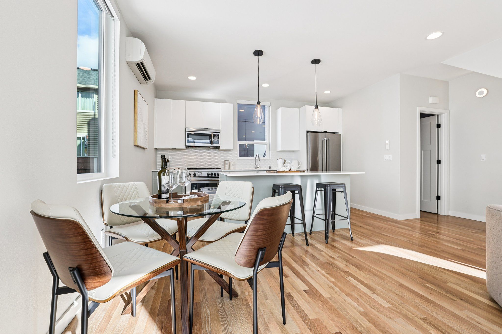 Refined modern living & thoughtful design combine beautifully in this standout 2019-built townhome, nestled just blocks from the heart of Ballard. Tucked back away from the street in a charming residential area, this home stays exceptionally quiet yet is just moments from all the buzz of this vibrant area. Light-filled, open concept living spaces are comfortable yet spacious & inviting, featuring a rare square floor plan, tall ceilings, hardwood floors, efficient mini-splits & high-end blinds. Pick up take out from an endless list of great restaurants nearby or cook to your heart's content in the sleek chef's kitchen, equipped w/ stainless appliances from KitchenAid & Bosch, quartz counters & a huge center island w/ bar seats to gather around. 3 bedrooms are thoughtfully laid out to maximize privacy: 2 beds on the lower level share a full bath while the primary retreat encompasses the full upper level, complete w/ a walk-in closet, full ensuite bath & a private balcony. The rooftop deck basks in fantastic sunlight & striking views of the neighborhood + Mt Rainier & the Space Needle; plumbed gas & water lines are ready for your grill, fire pit & container garden. Enjoy the convenience of designated off-street parking & explore your walkable neighborhood; within minutes, you'll find 5-star dining, nightlife, boutiques, the year-round farmers market, the Burke Gilman Trail, the Ballard Locks & multiple bus lines to transport you downtown or beyond w/ ease.