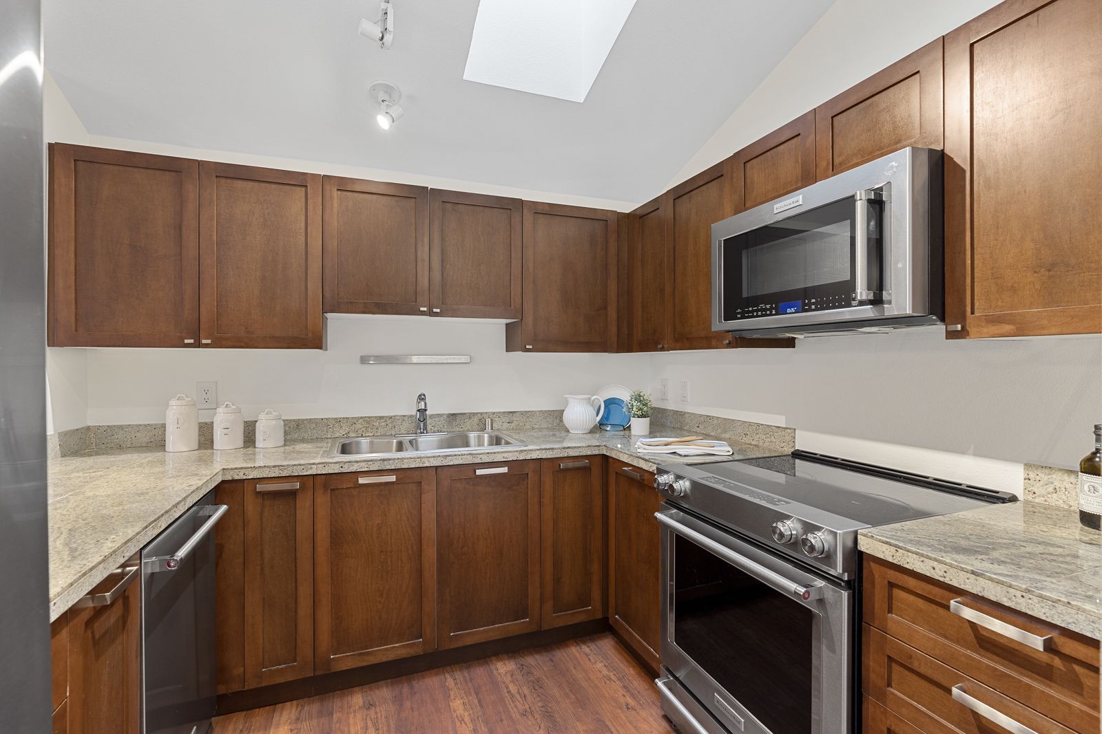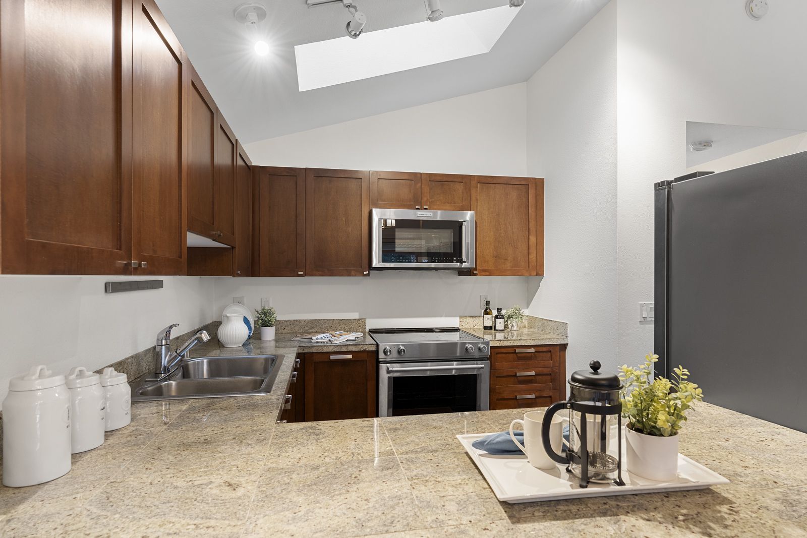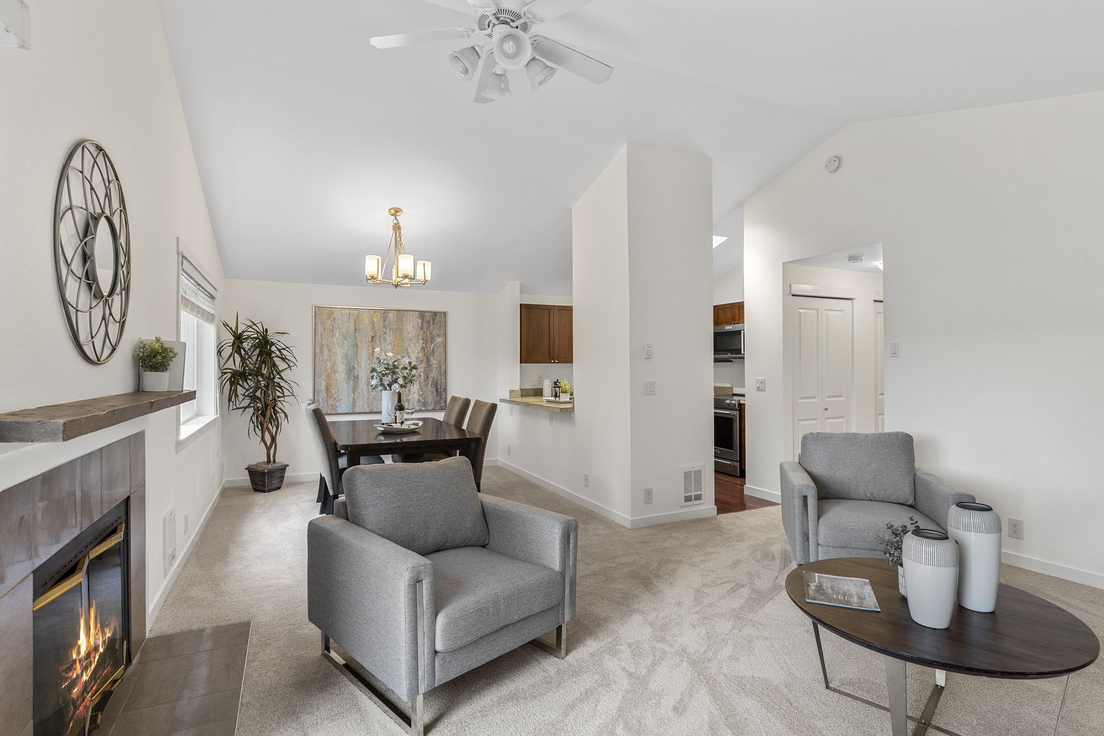 The unique layout of this top floor, stairs-free condo basks in warm all-day sunlight highlighting vaulted ceilings, remodeled bathrooms, a beautifully updated kitchen, new carpet, new appliances, granite countertops, fresh paint and comfortable living spaces.