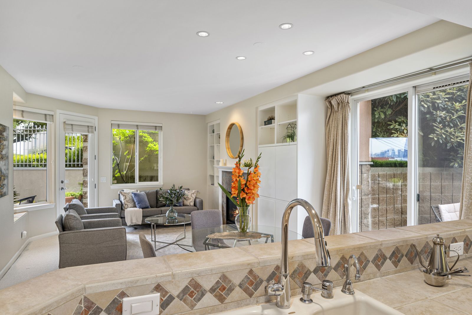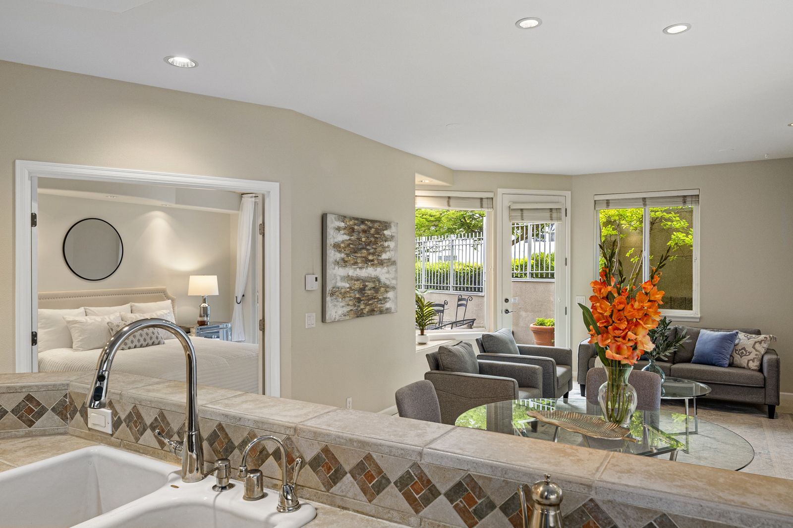 This corner unit lives large with a desirable great room floor plan with living, dining, and kitchen opening up to 2 sunny, private patios surrounded by lush landscaping with lake and city views.