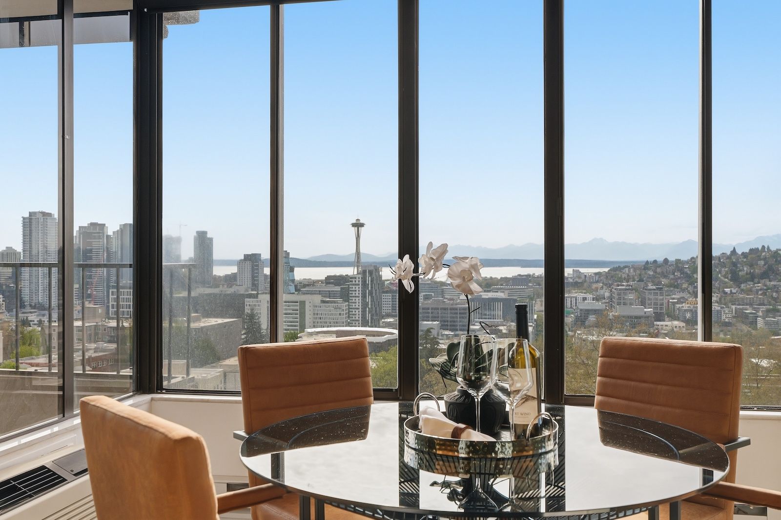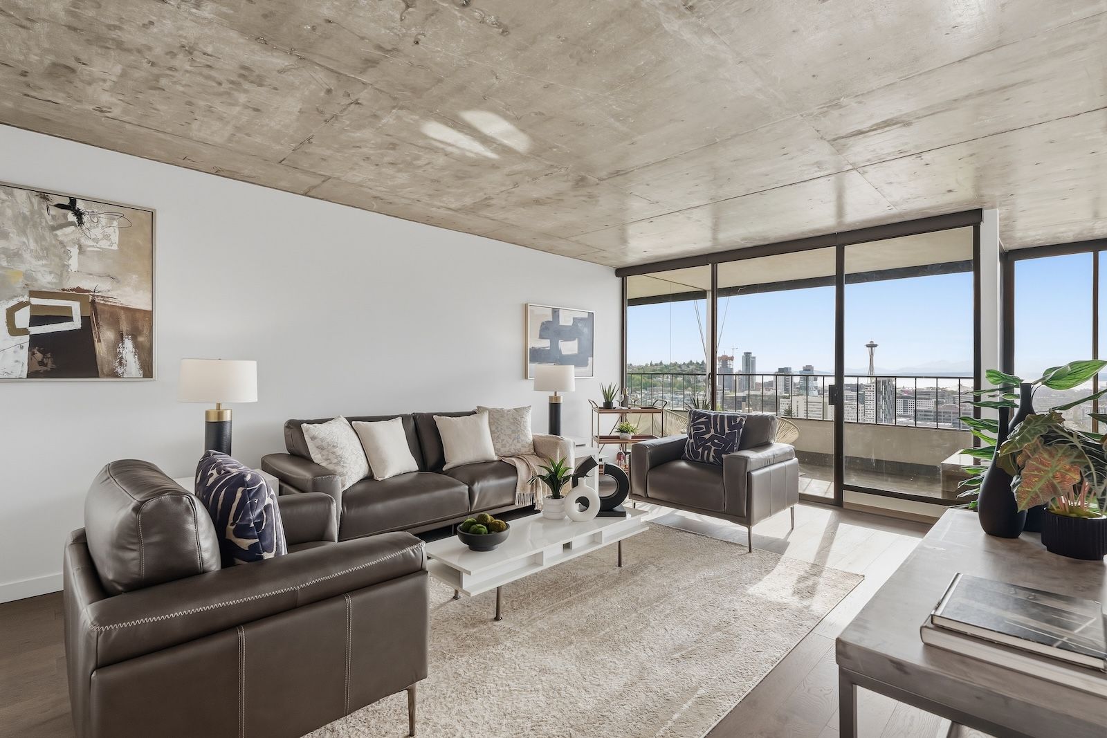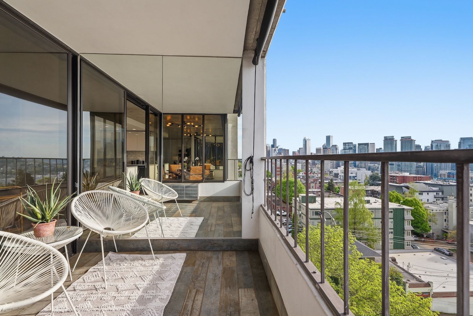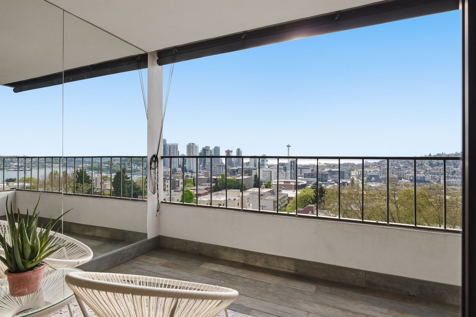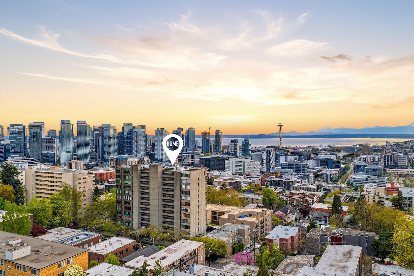 A true unicorn resale at The Shannon: this is not your typical condo. Taken down to the shell and reimagined with a striking industrial-modern aesthetic, this one-of-a-kind 2 bedroom, 1.75 bathroom unit with the building's most sought-after B floor plan pairs exceptional views with a level of design and finish rarely found anywhere. Wake up to sweeping outlooks of the downtown skyline, Space Needle, Lake Union and Elliott Bay, then step onto your large private deck to take it all in. Inside, nearly every surface has been elevated with intention: polished concrete ceilings, walls of glass, quartz countertops, marble subway tile, custom built-ins with integrated outlets, custom closets, updated lighting, and beautifully renovated bathrooms. Warm, dramatic and completely distinct from standard inventory. Fantastic light and air flow, plus built-in A/C units to keep you cool. Solid concrete construction delivers the kind of quiet that has to be experienced. The practicalities match the vision: the HOA covers all utilities including electricity and internet, has no rental cap, and offers fantastic amenities to residents: secure parking, storage, indoor heated pool, sauna, fitness center, and ample guest parking for when friends come to visit. Walkable access to Capitol Hill's best restaurants, and an easy stroll downtown complete the picture. The Shannon offers a rare blend of privacy, quiet, amenities and long-term appeal for the urban dweller who wants to have it all.