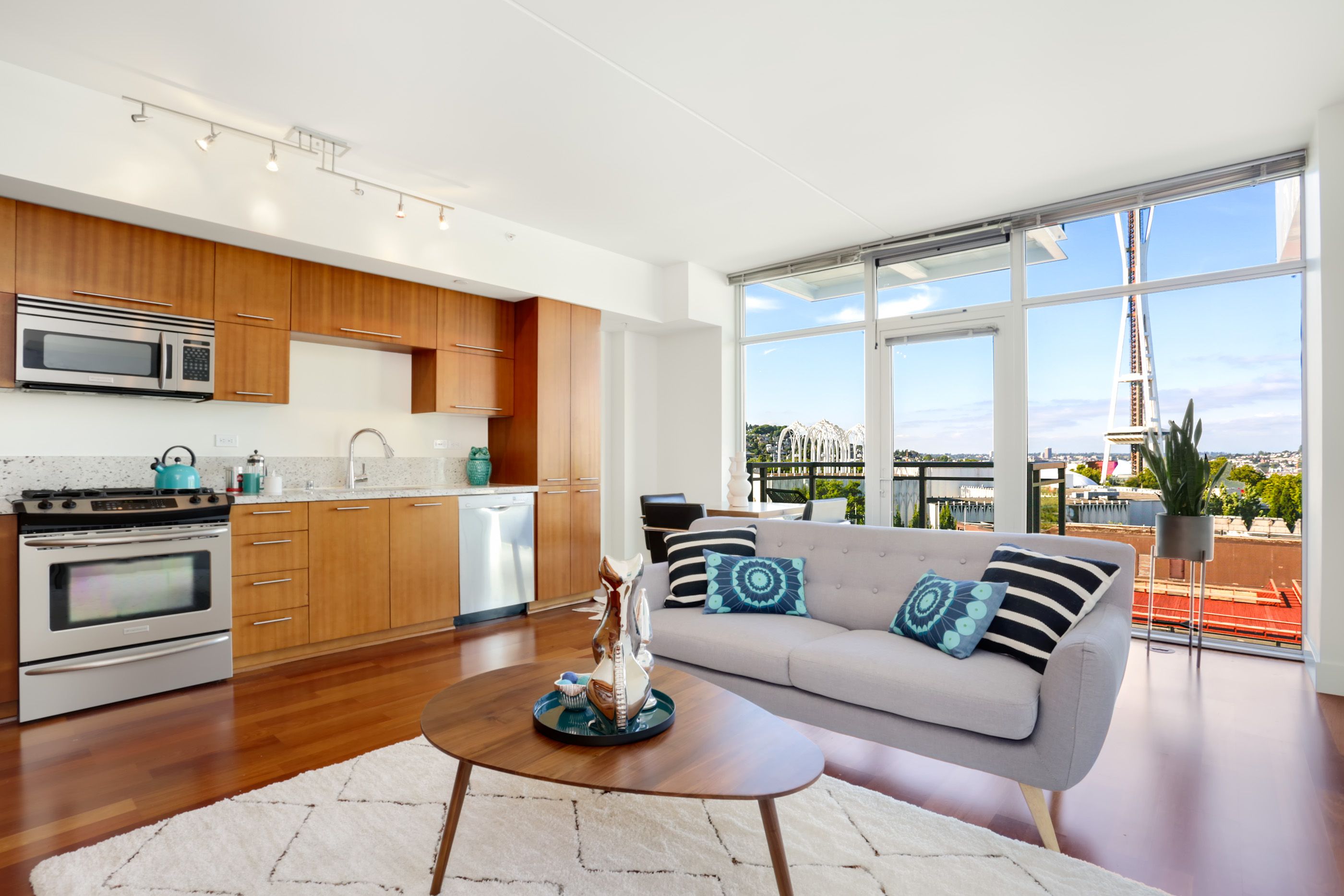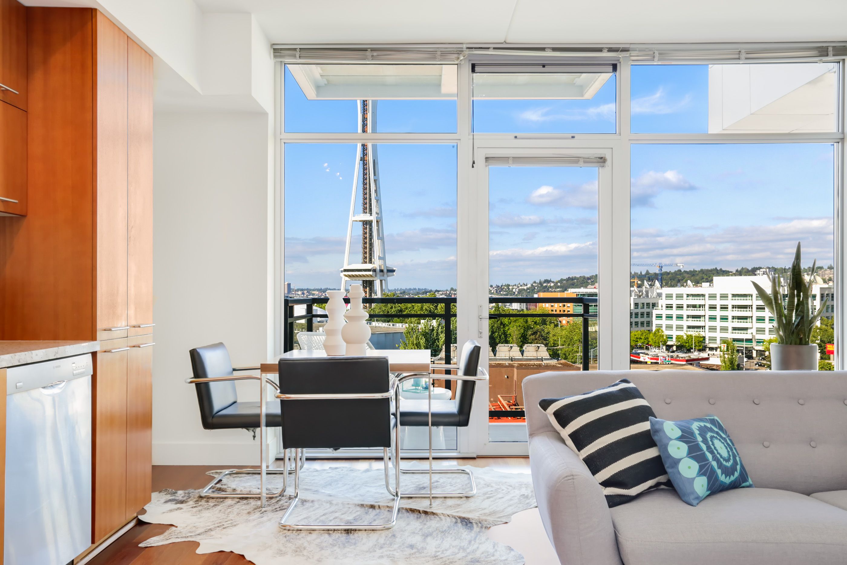 Gorgeous, unobstructed Space Needle views thru floor-to-ceiling windows in this luxurious, rarely available upper floor 1-bed, 1 bath unit at the Gallery. Freshly painted and well appointed, you’ll love living at the center of it all just steps from the waterfront, Seattle Center, and top-notch dining. Watch fireworks, seaplanes, & sparkling city lights all from your balcony! Fab amenities incl gym, 24hr concierge, and rooftop deck w/dog area. No rental cap! Strong HOA!